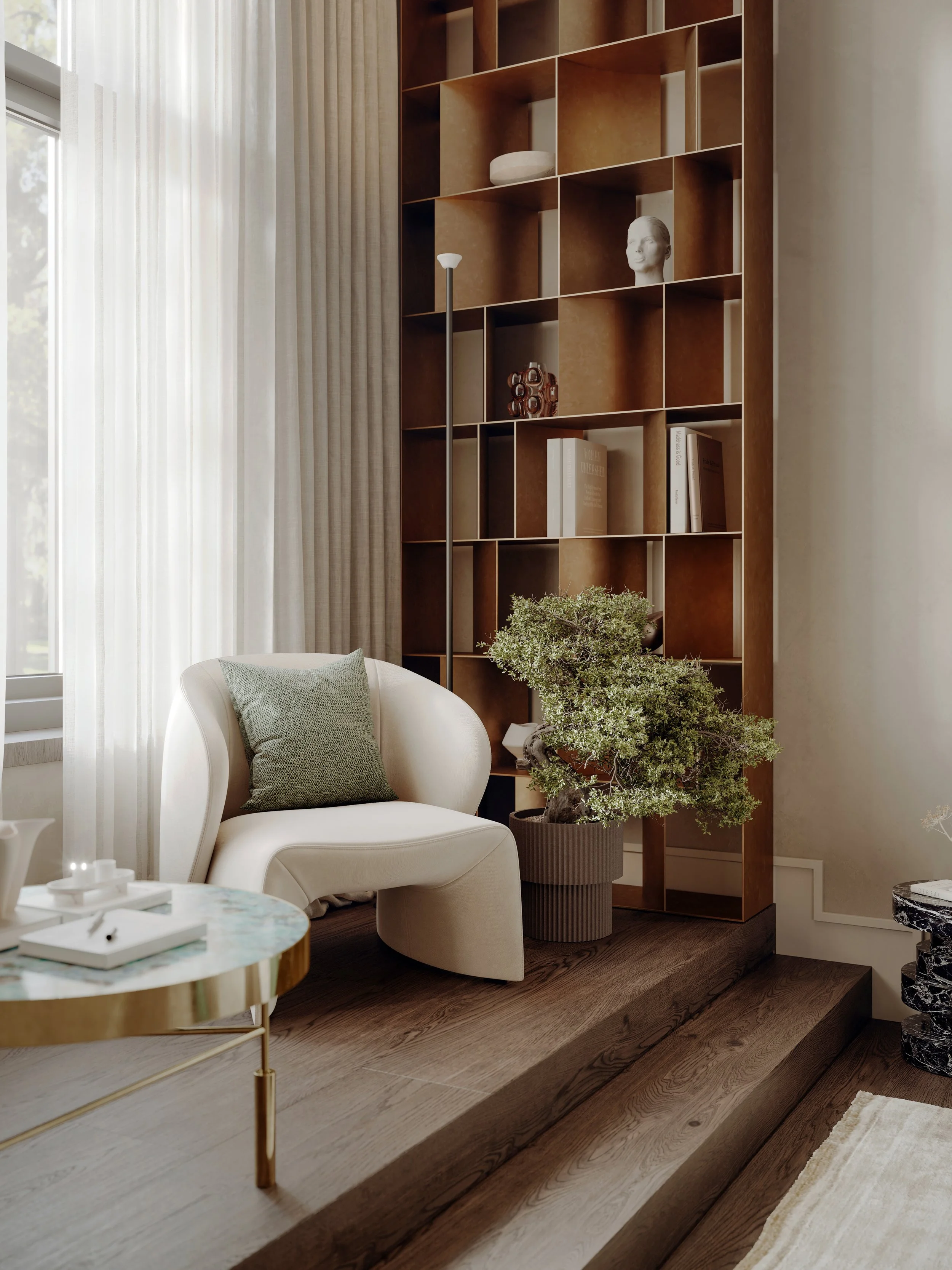 This cozy duplex interior with multi-level floors was designed for a developer. We incorporated soft, tactile textures, soothing natural colors, and carefully selected artwork to create a premium-class interior that is both inviting and functional.