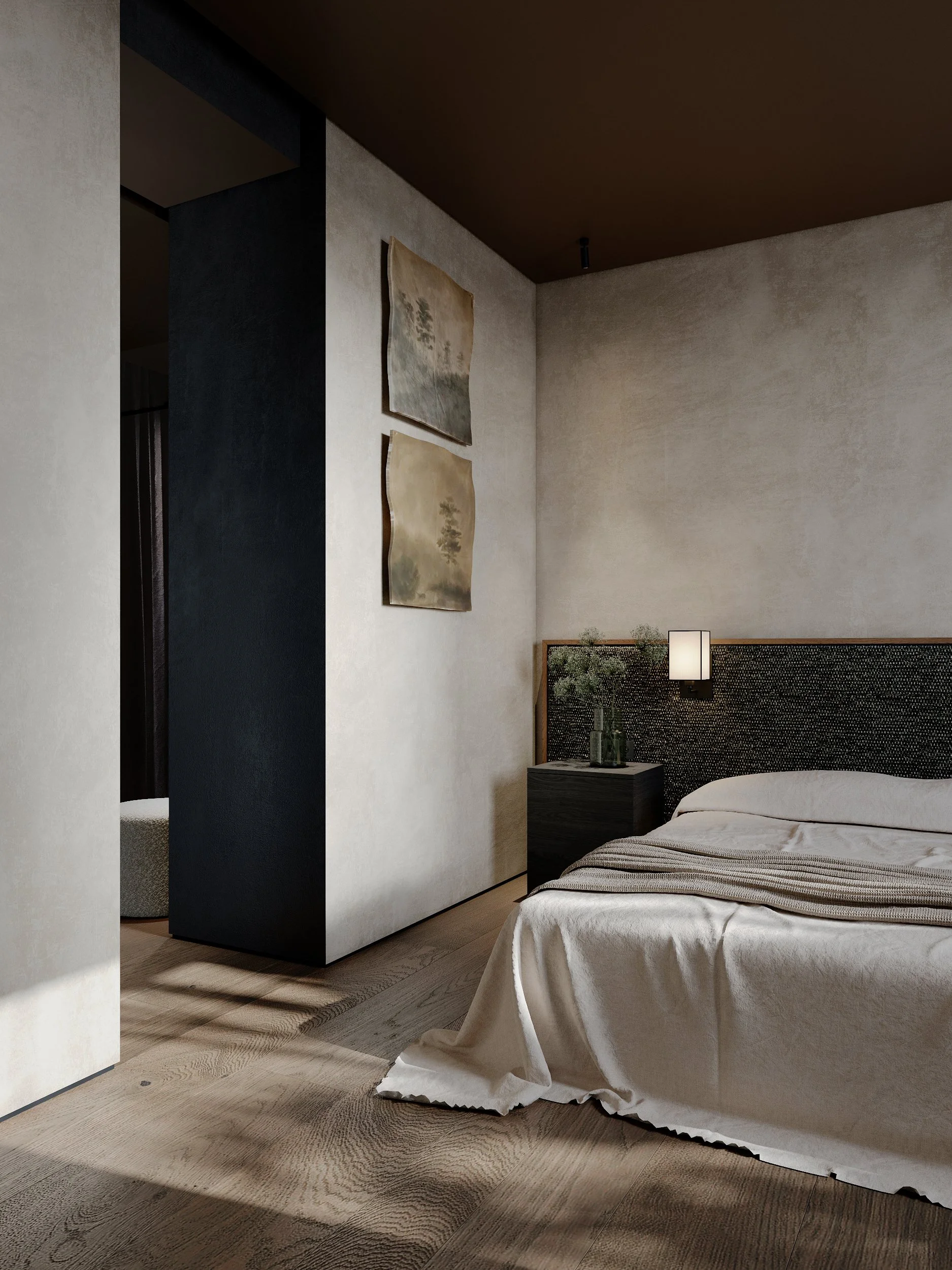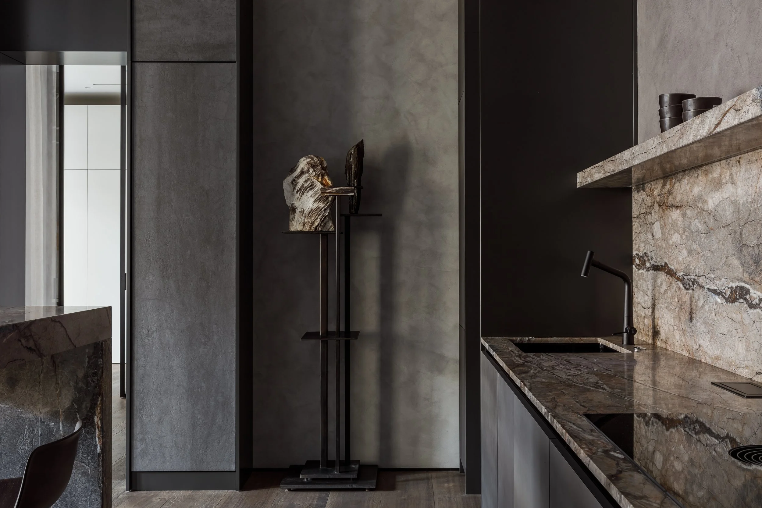 This apartment interior design combines natural slate, solid wood, marble, oxidized metal, and glass to create a harmonious living space. The addition of a cozy fireplace brings warmth, while the design fosters a serene, meditative atmosphere, perfect for modern homes and apartments in the heart of the city.